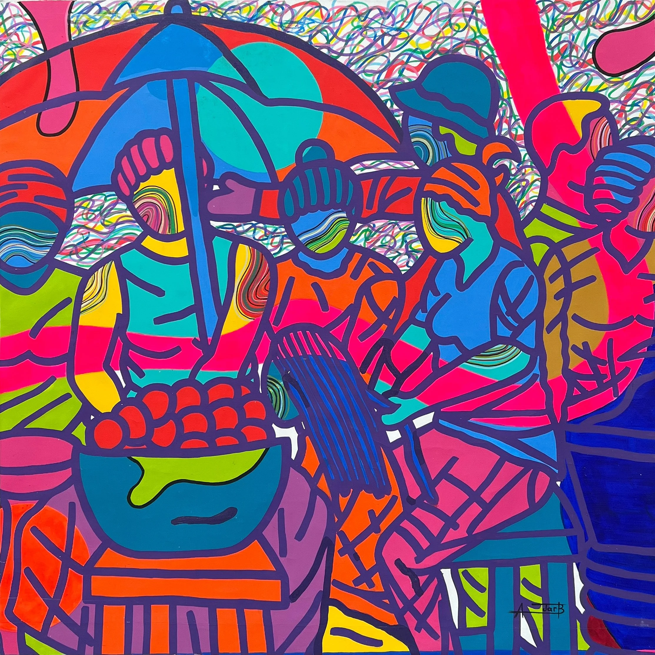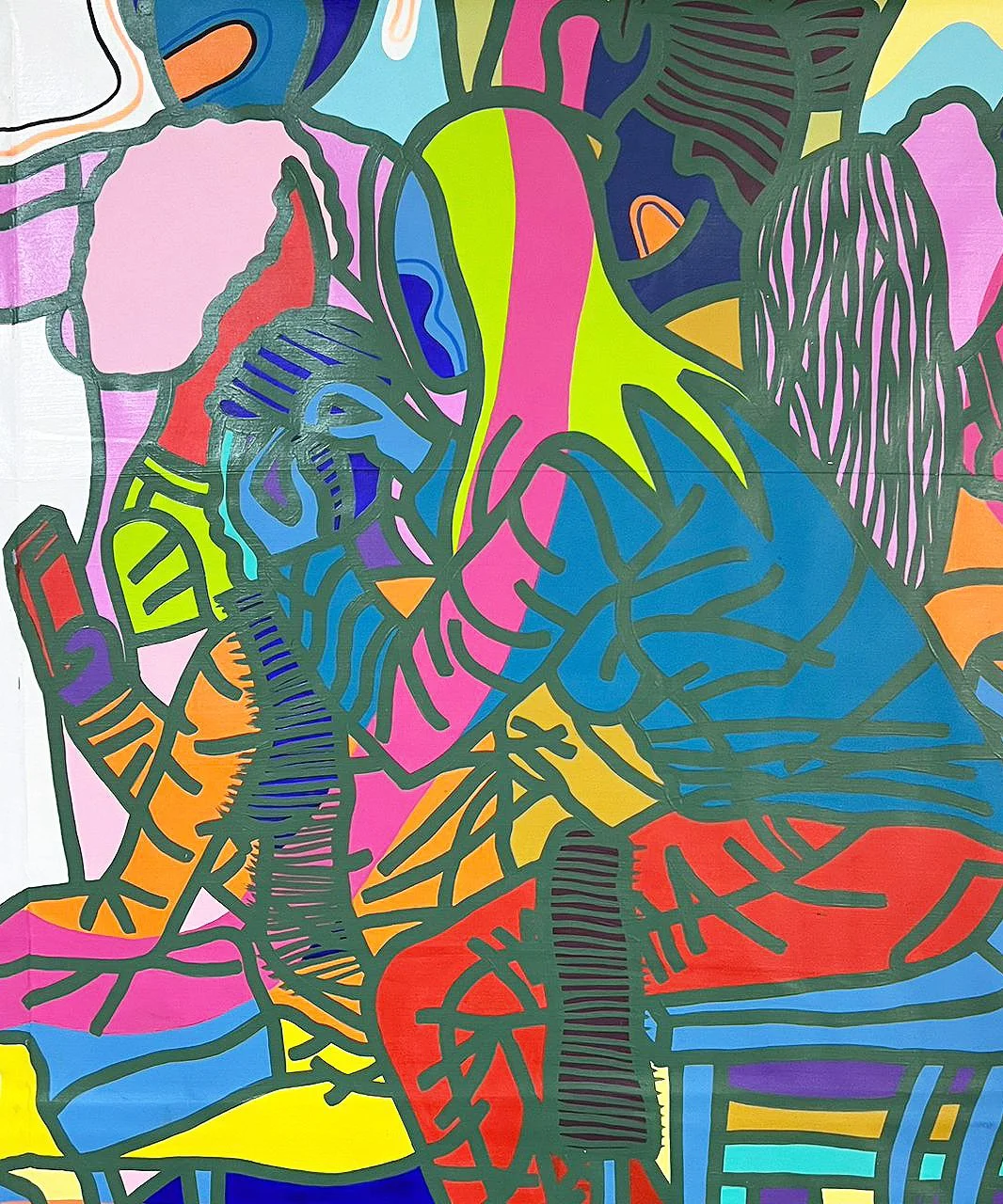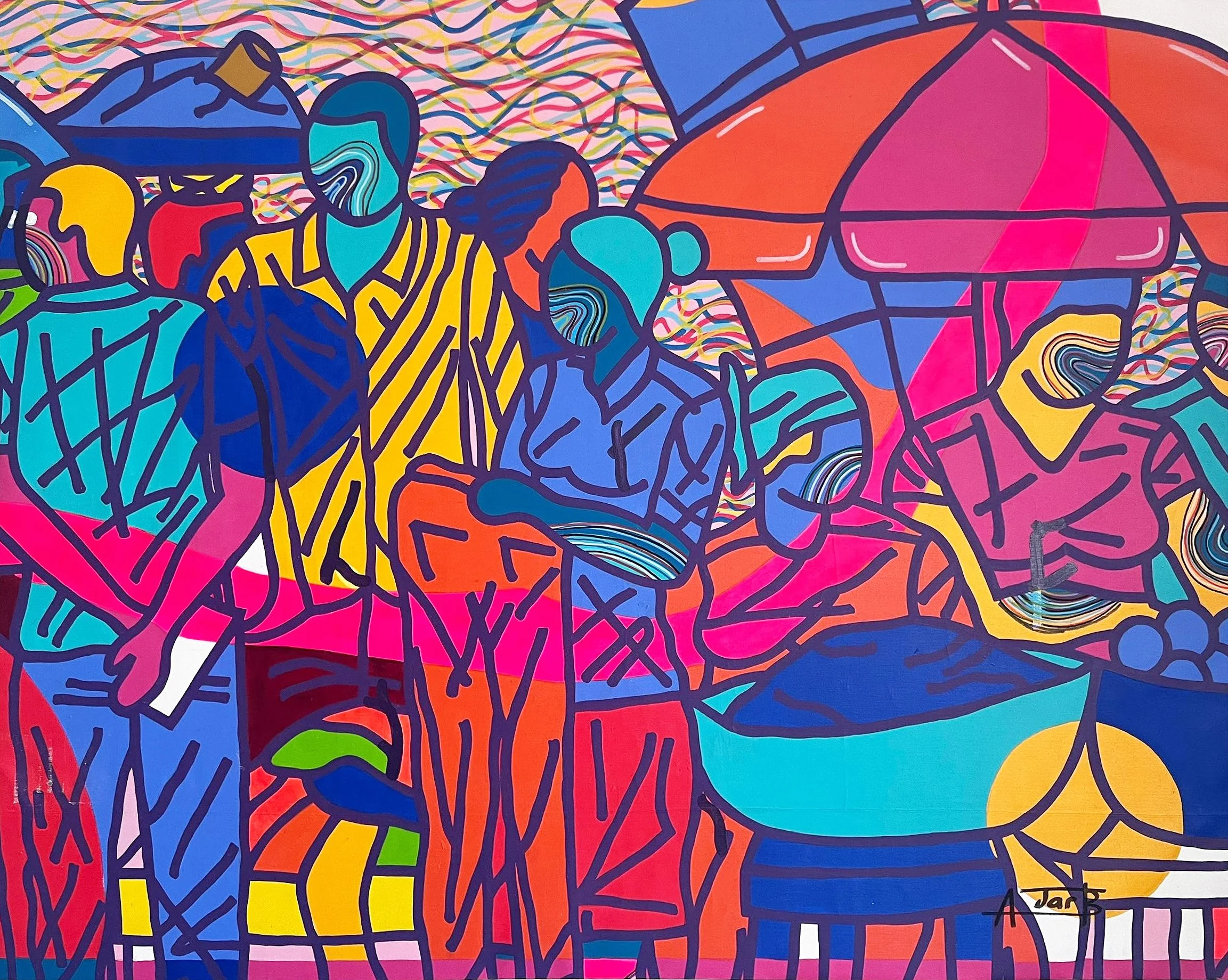 Entre la spontanéité du Pop, la liberté de l’abstraction et la mémoire des studios photo de son enfance, il invente une peinture chaleureuse et urbaine, à la fois narrative et symbolique. Son travail célèbre la vitalité des communautés, la dignité des corps et l’imagination comme force de transformation.